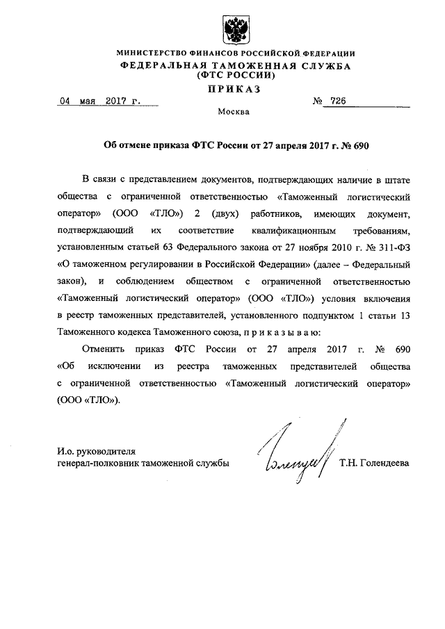 "ОБ ОТМЕНЕ ПРИКАЗА ФТС РОССИИ ОТ 27 АПРЕЛЯ 2017 Г. N 690"