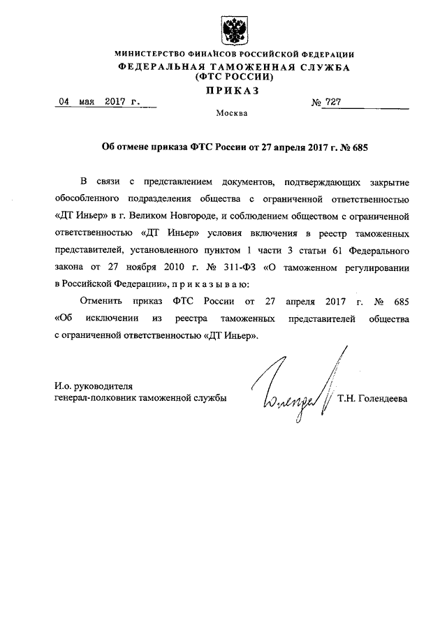 "ОБ ОТМЕНЕ ПРИКАЗА ФТС РОССИИ ОТ 27 АПРЕЛЯ 2017 Г. N 685"
