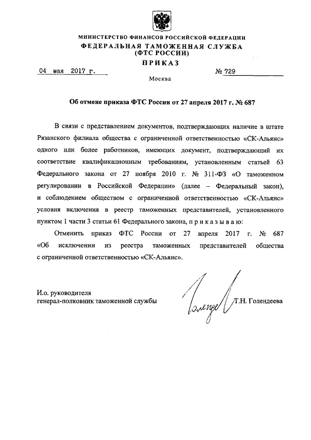 "ОБ ОТМЕНЕ ПРИКАЗА ФТС РОССИИ ОТ 27 АПРЕЛЯ 2017 Г. N 687"
