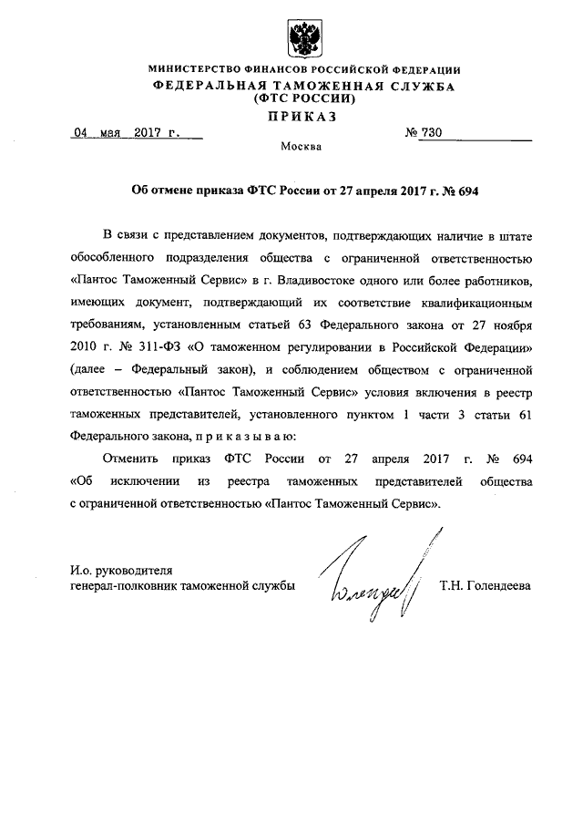 "ОБ ОТМЕНЕ ПРИКАЗА ФТС РОССИИ ОТ 27 АПРЕЛЯ 2017 Г. N 694"
