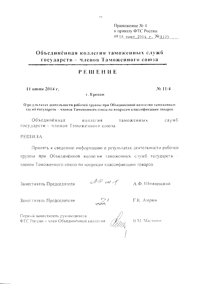 ПРИКАЗ ФТС РФ от 18.06.2014 N 1125