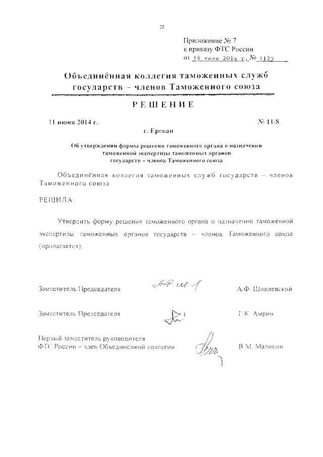 ПРИКАЗ ФТС РФ от 18.06.2014 N 1125