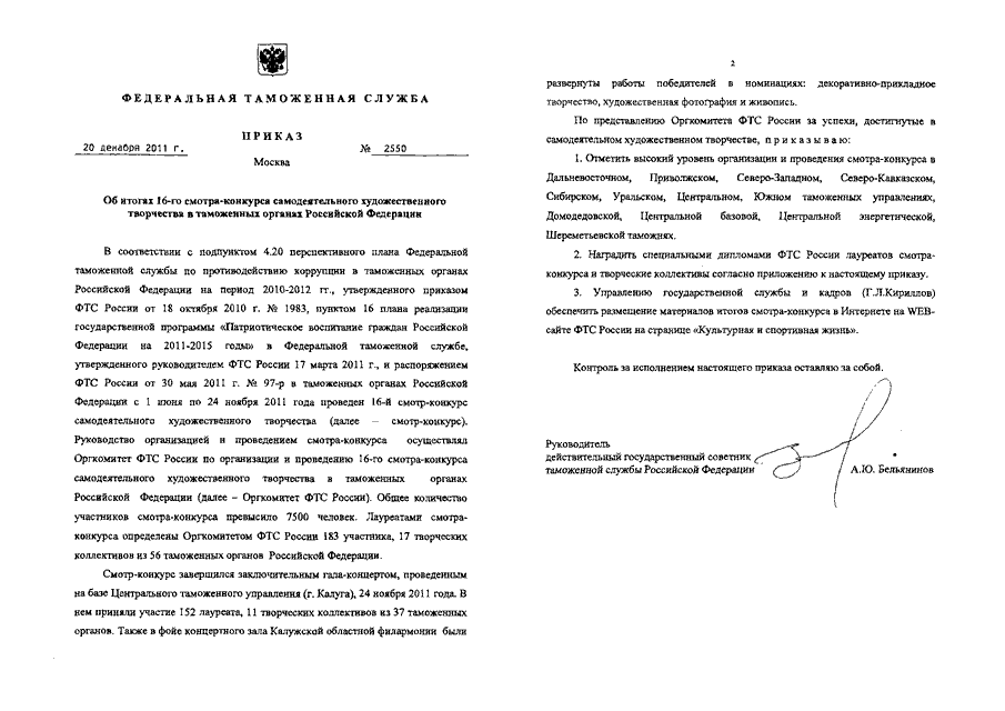 ПРИКАЗ ФТС РФ от 20.12.2011 N 2550