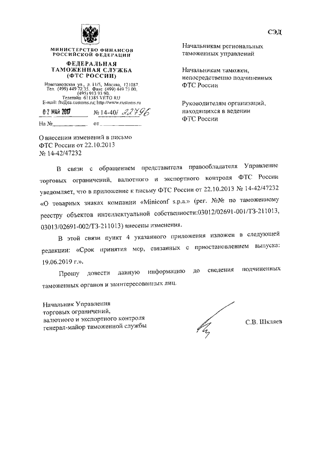 ПИСЬМО ФТС РФ от 02.05.2017 N 14-40/22796