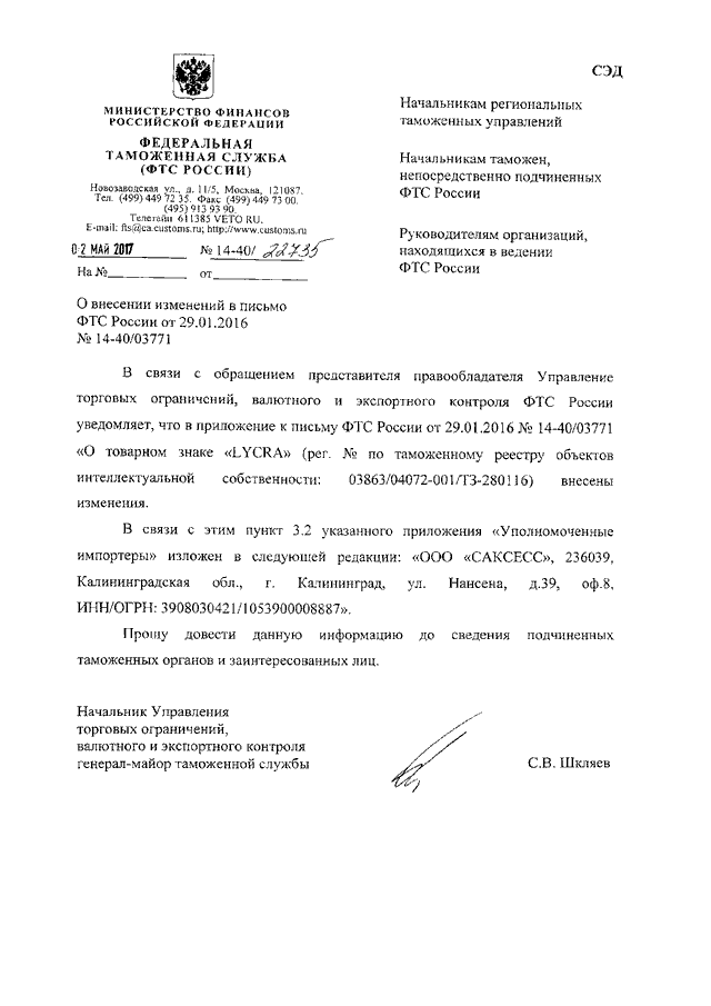 "О ВНЕСЕНИИ ИЗМЕНЕНИЙ В ПИСЬМО ФТС РОССИИ ОТ 29.01.2016 N 14-40/03771"