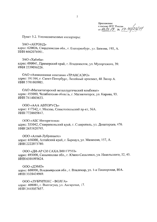 ПИСЬМО ФТС РФ от 03.05.2017 N 14-40/23011