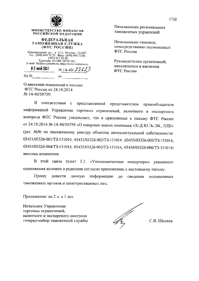 ПИСЬМО ФТС РФ от 05.05.2017 N 14-40/23623