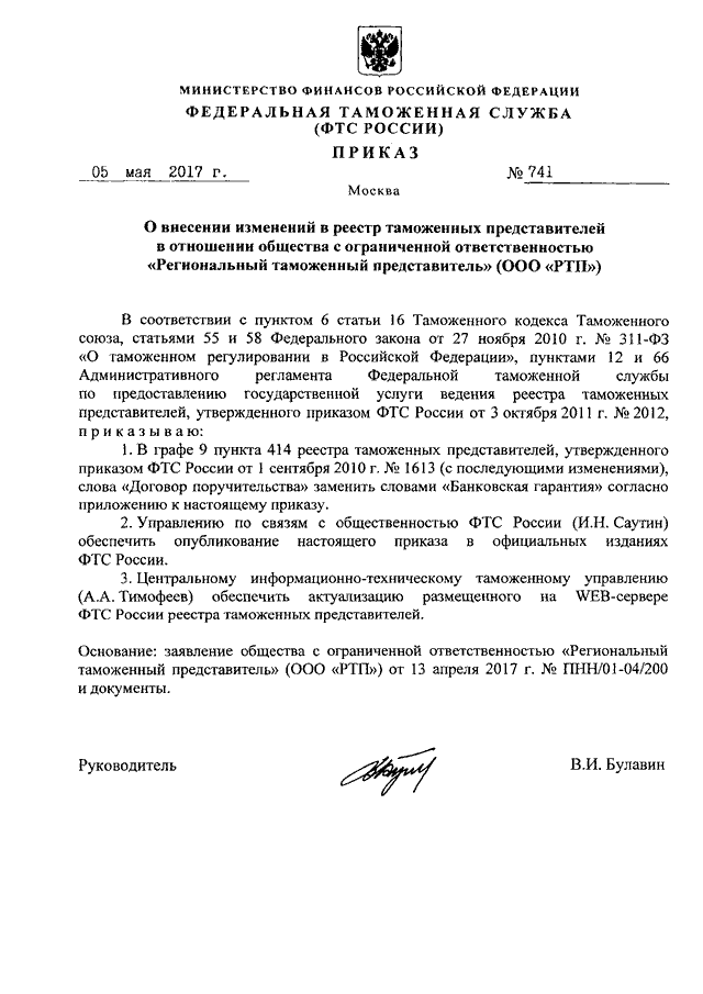 ПРИКАЗ ФТС РФ от 05.05.2017 N 741