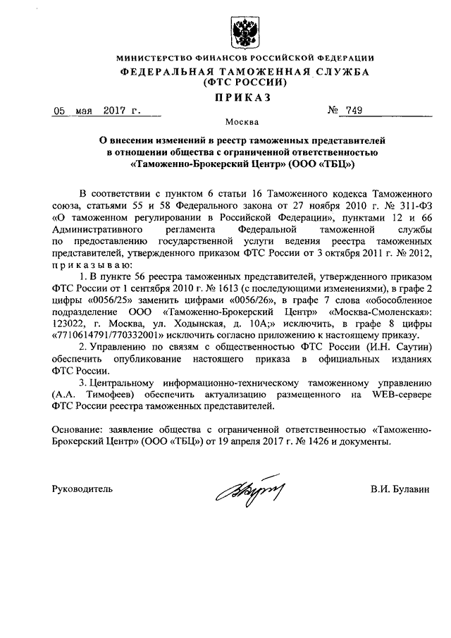 ПРИКАЗ ФТС РФ от 05.05.2017 N 749