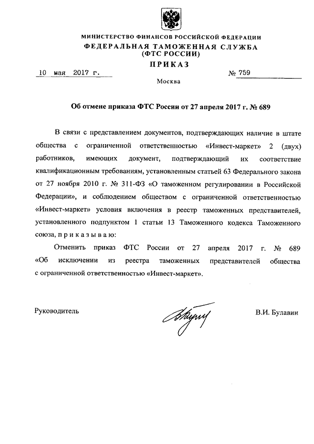 "ОБ ОТМЕНЕ ПРИКАЗА ФТС РОССИИ ОТ 27 АПРЕЛЯ 2017 Г. N 689"
