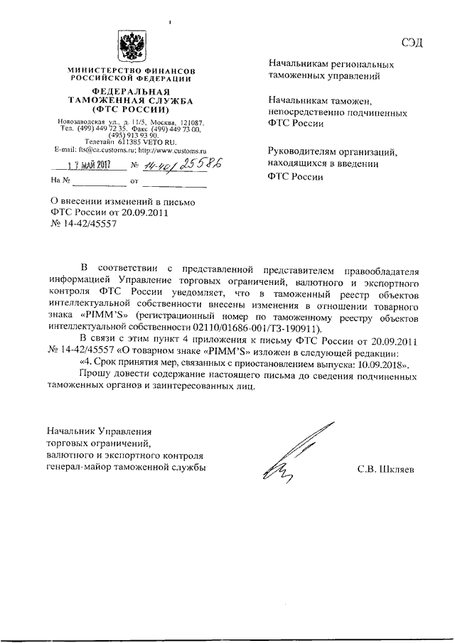 ПИСЬМО ФТС РФ от 17.05.2017 N 14-40/25586