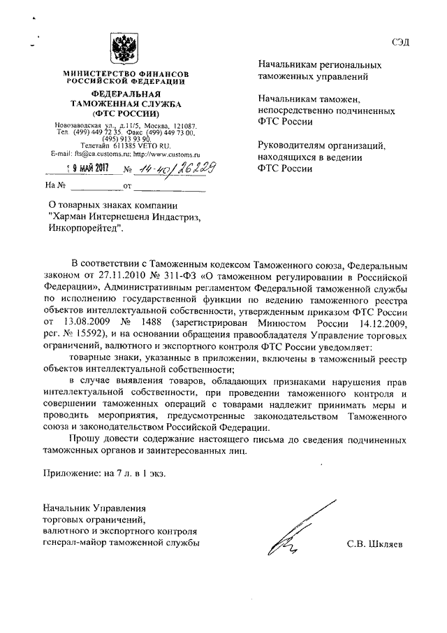 ПИСЬМО ФТС РФ от 19.05.2017 N 14-40/26229