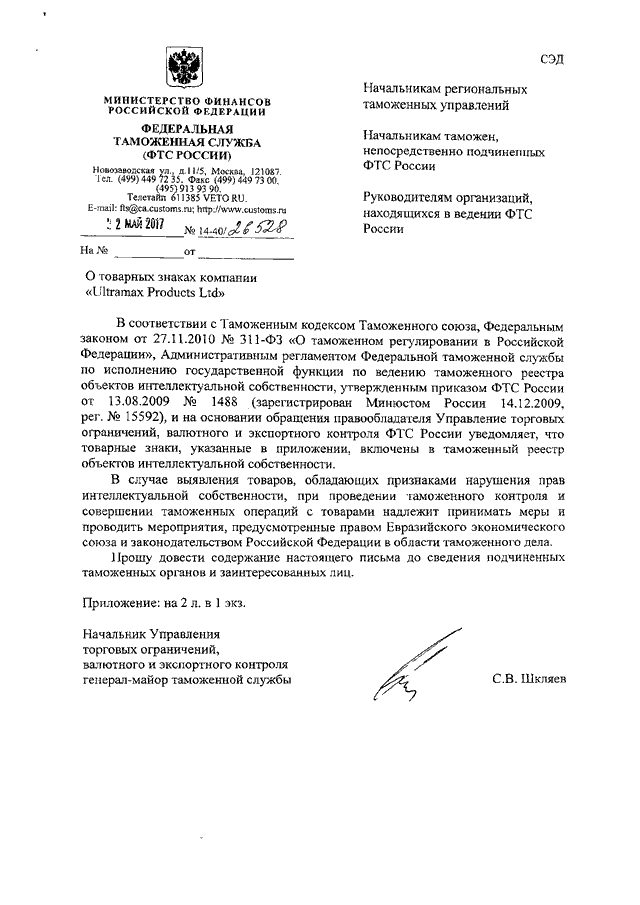 ПИСЬМО ФТС РФ от 22.05.2017 N 14-40/26528