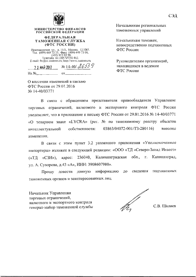 "О ВНЕСЕНИИ ИЗМЕНЕНИЙ В ПИСЬМО ФТС РОССИИ ОТ 29.01.2016 N 14-40/03771"