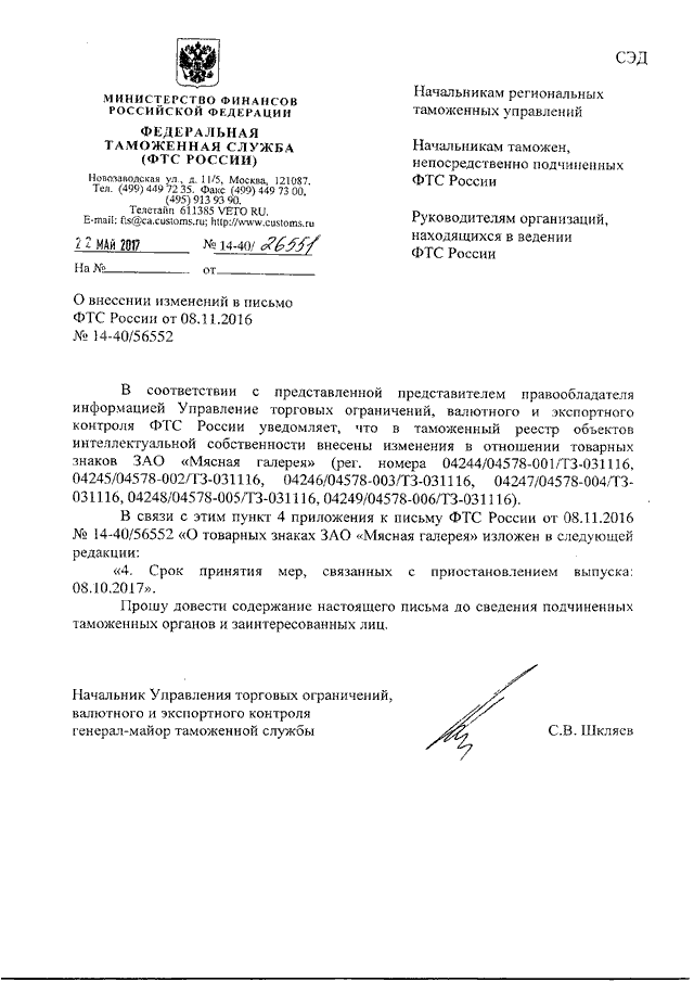"О ВНЕСЕНИИ ИЗМЕНЕНИЙ В ПИСЬМО ФТС РОССИИ ОТ 08.11.2016 N 14-40/56552"