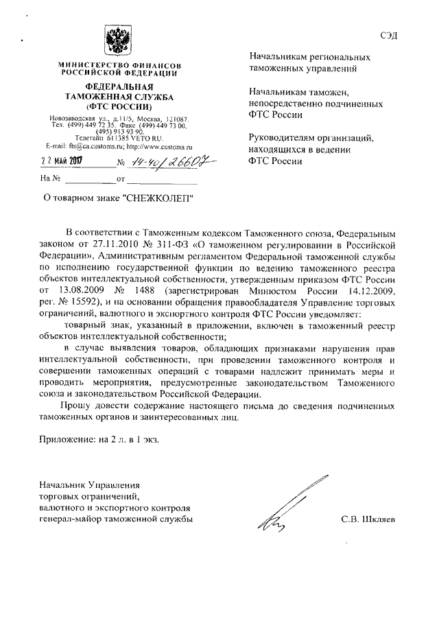 ПИСЬМО ФТС РФ от 22.05.2017 N 14-40/26607