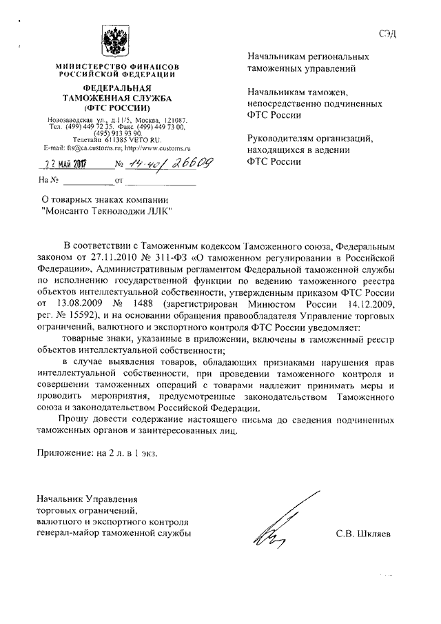 ПИСЬМО ФТС РФ от 22.05.2017 N 14-40/26609