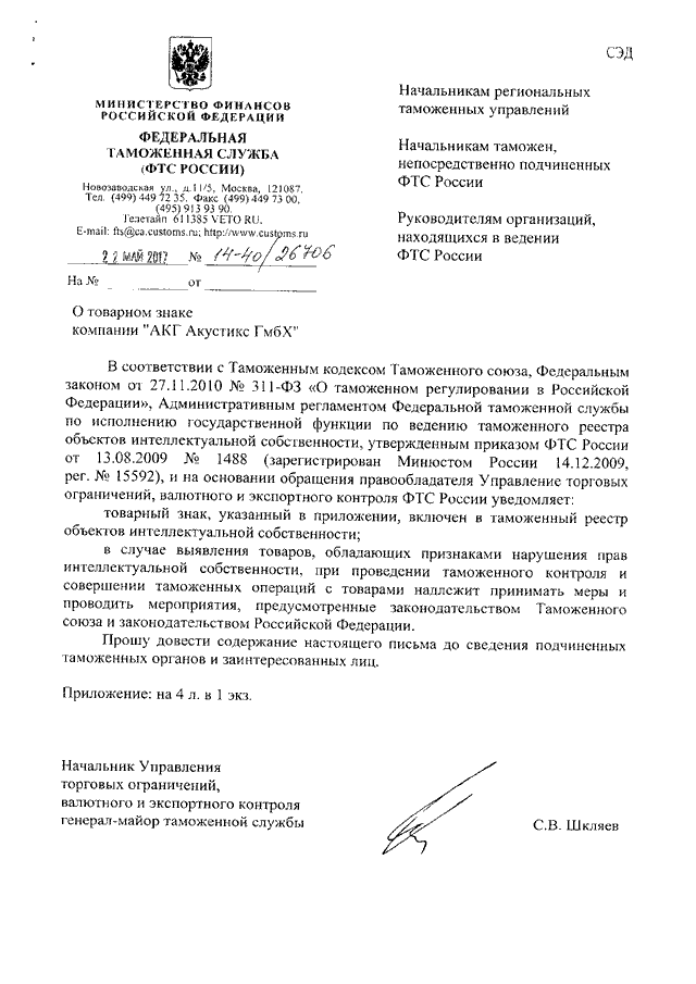 ПИСЬМО ФТС РФ от 22.05.2017 N 14-40/26706