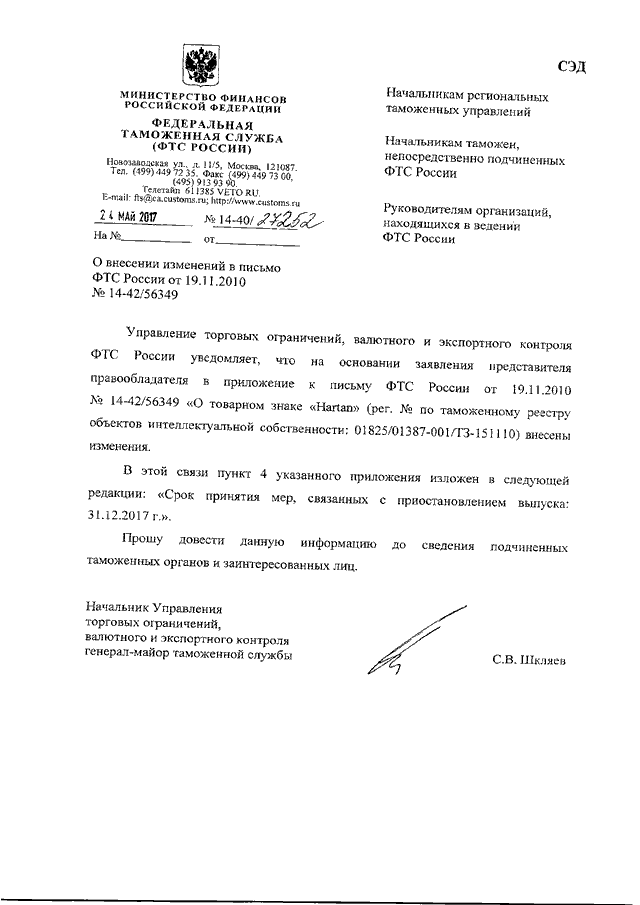 ПИСЬМО ФТС РФ от 24.05.2017 N 14-40/27252