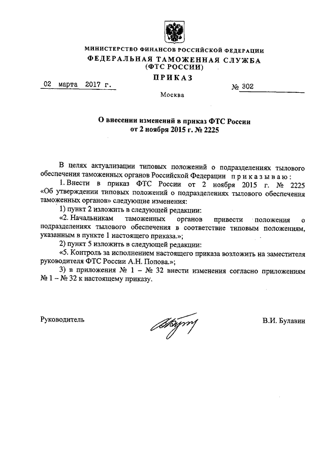 ПРИКАЗ ФТС РФ от 02.03.2017 N 302