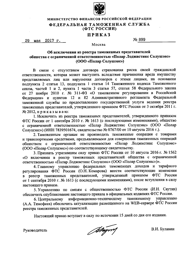 ПРИКАЗ ФТС РФ от 29.05.2017 N 899