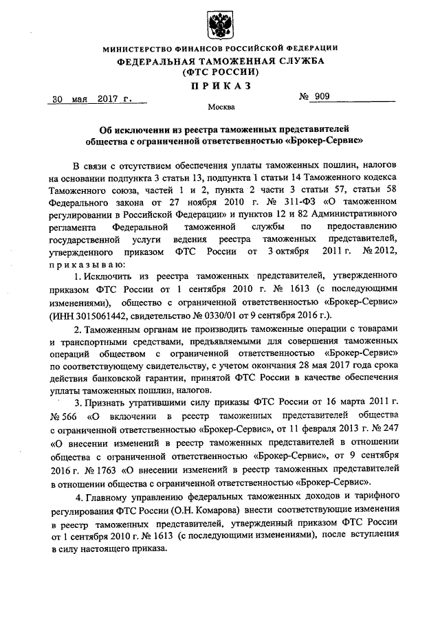 ПРИКАЗ ФТС РФ от 30.05.2017 N 909