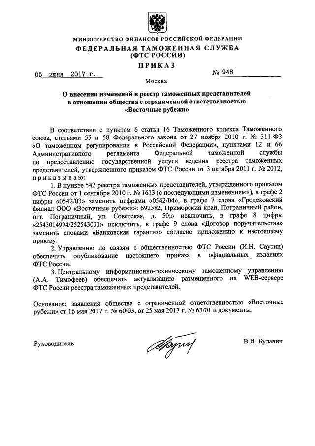 ПРИКАЗ ФТС РФ от 05.06.2017 N 948