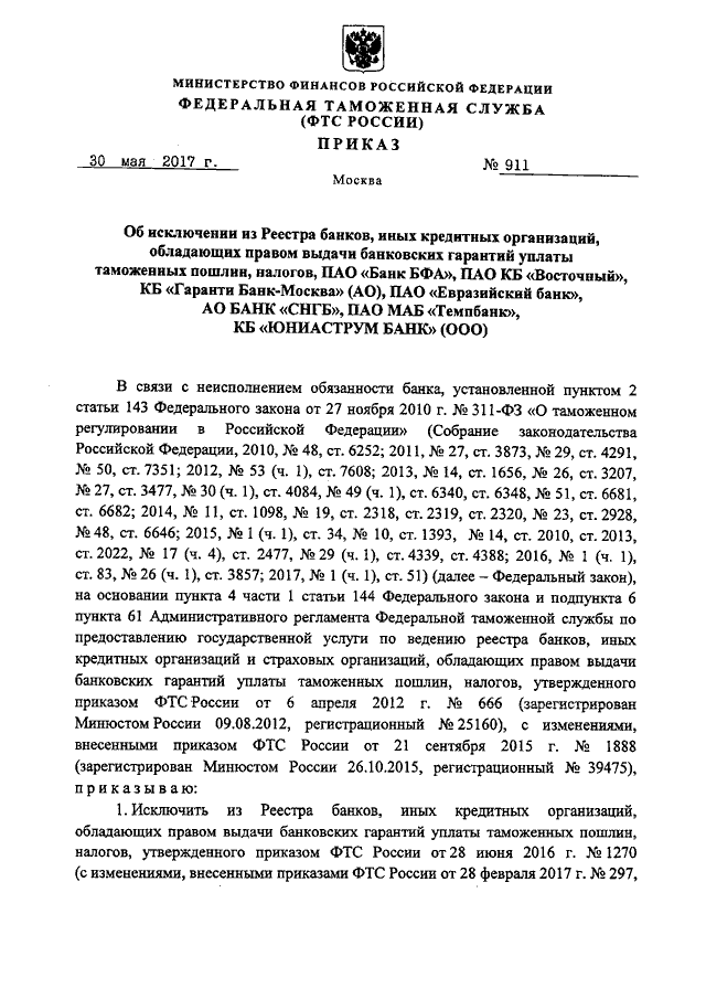 ПРИКАЗ ФТС РФ от 30.05.2017 N 911 "ОБ ИСКЛЮЧЕНИИ ИЗ РЕЕСТРА БАНКОВ, ИНЫХ КРЕДИТНЫХ ОРГАНИЗАЦИЙ,