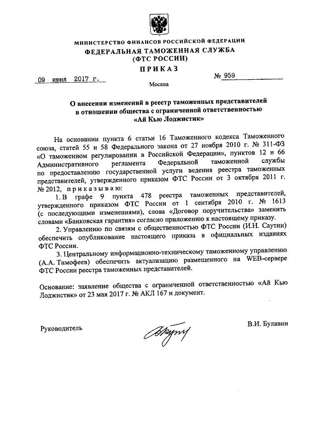 ПРИКАЗ ФТС РФ от 09.06.2017 N 959