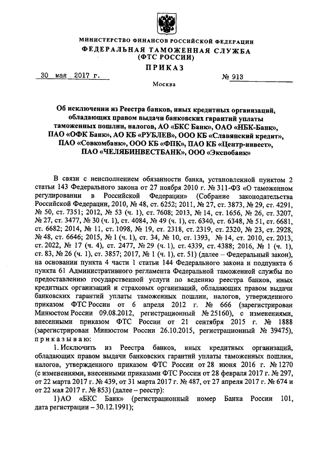 ПРИКАЗ ФТС РФ от 30.05.2017 N 913 "ОБ ИСКЛЮЧЕНИИ ИЗ РЕЕСТРА БАНКОВ, ИНЫХ КРЕДИТНЫХ ОРГАНИЗАЦИЙ,