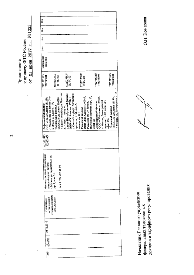 ПРИКАЗ ФТС РФ от 21.06.2017 N 1033