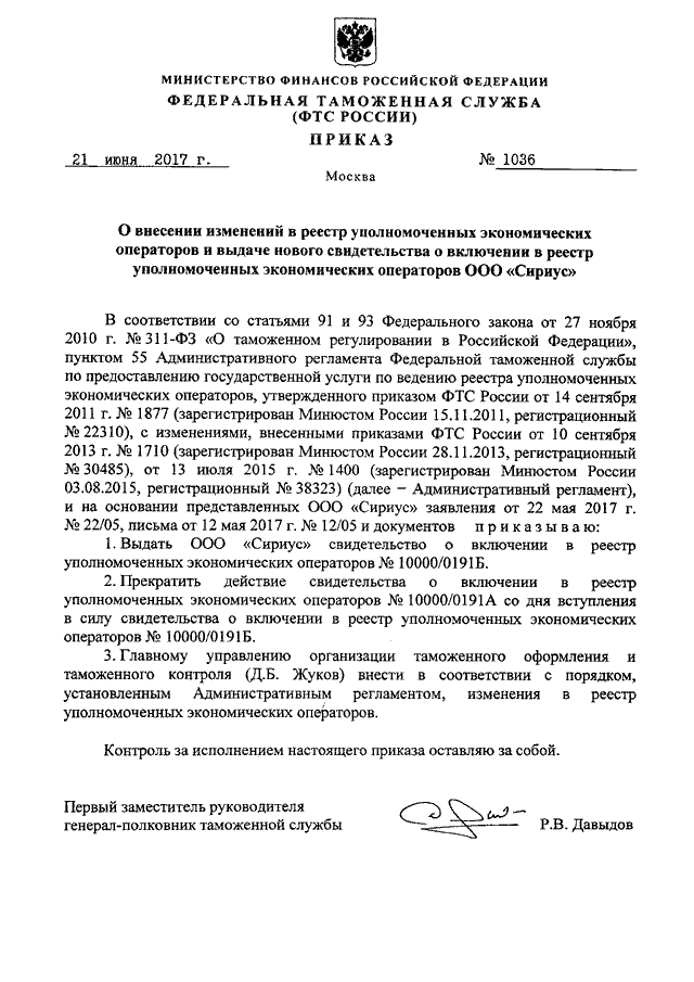 ПРИКАЗ ФТС РФ от 21.06.2017 N 1036