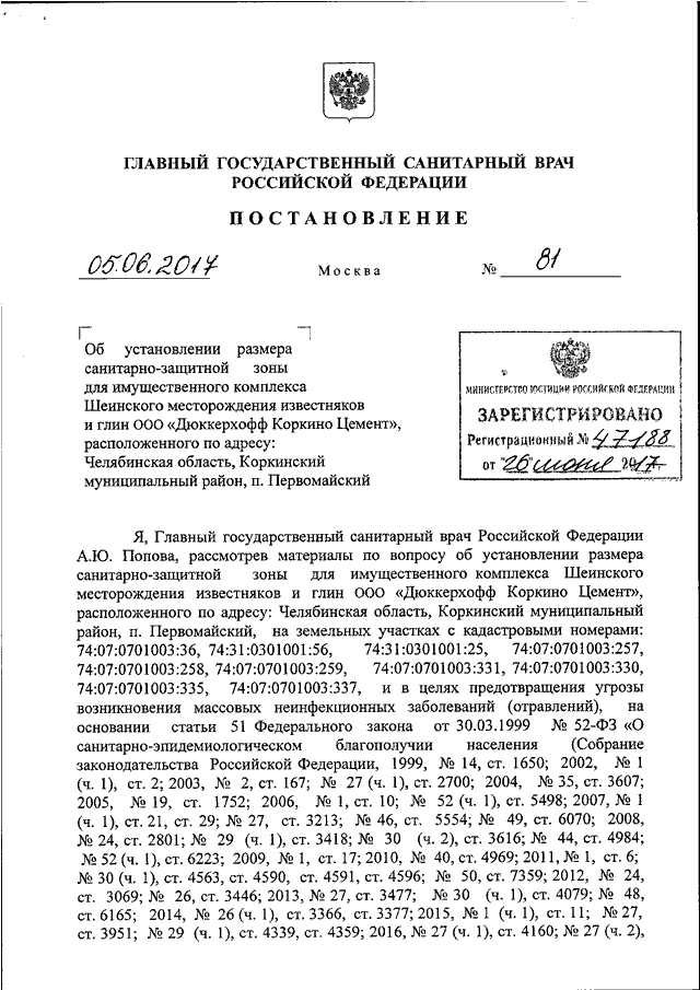"ОБ УСТАНОВЛЕНИИ РАЗМЕРА САНИТАРНО - ЗАЩИТНОЙ ЗОНЫ ДЛЯ ИМУЩЕСТВЕННОГО КОМПЛЕКСА ШЕИНСКОГО МЕСТОРОЖДЕНИЯ ИЗВЕСТНЯКОВ И ГЛИН ООО "ДЮККЕРХОФФ КОРКИНО ЦЕМЕНТ", РАСПОЛОЖЕННОГО ПО АДРЕСУ: ЧЕЛЯБИНСКАЯ ОБЛАСТЬ, КОРКИНСКИЙ МУНИЦИПАЛЬНЫЙ РАЙОН, П. ПЕРВОМАЙСКИЙ"