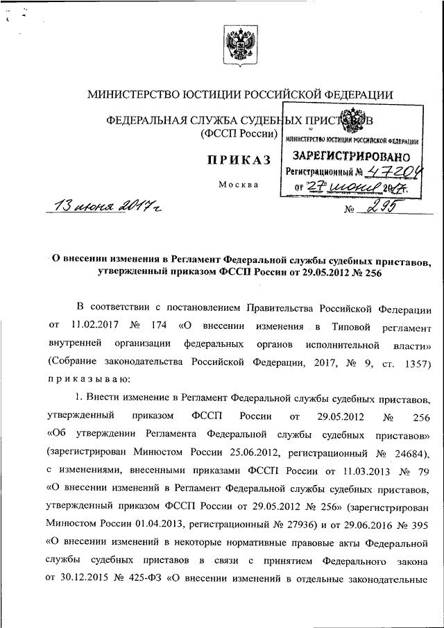 ПРИКАЗ ФССП РФ от 13.06.2017 N 295
