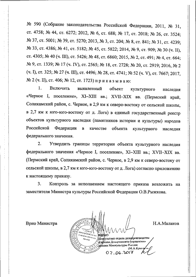 "О ВКЛЮЧЕНИИ ВЫЯВЛЕННОГО ОБЪЕКТА КУЛЬТУРНОГО НАСЛЕДИЯ "ЧЕРНОЕ I, ПОСЕЛЕНИЕ", XI - XIII ВВ.; XVII - XIX ВВ. В ЕДИНЫЙ ГОСУДАРСТВЕННЫЙ РЕЕСТР ОБЪЕКТОВ КУЛЬТУРНОГО НАСЛЕДИЯ (ПАМЯТНИКОВ ИСТОРИИ И КУЛЬТУРЫ) НАРОДОВ РОССИЙСКОЙ ФЕДЕРАЦИИ В КАЧЕСТВЕ ОБЪЕКТА КУЛЬТУРНОГО НАСЛЕДИЯ ФЕДЕРАЛЬНОГО ЗНАЧЕНИЯ И УТВЕРЖДЕНИИ ГРАНИЦ ЕГО ТЕРРИТОРИИ (ПЕРМСКИЙ КРАЙ, СОЛИКАМСКИЙ РАЙОН, С. ЧЕРНОЕ, В 2,9 КМ К СЕВЕРО - ВОСТОКУ ОТ СЕЛЬСКОЙ ШКОЛЫ, В 2,7 КМ К ЮГО - ЮГО - ВОСТОКУ ОТ Д. ЛОГА)"