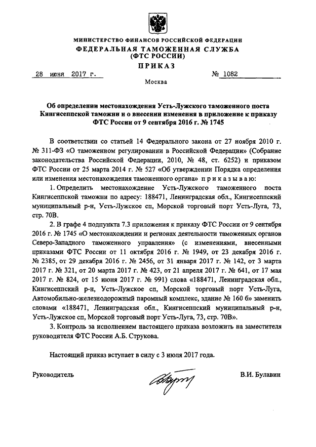 "ОБ ОПРЕДЕЛЕНИИ МЕСТОНАХОЖДЕНИЯ УСТЬ-ЛУЖСКОГО ТАМОЖЕННОГО ПОСТА КИНГИСЕППСКОЙ ТАМОЖНИ И О ВНЕСЕНИИ ИЗМЕНЕНИЯ В ПРИЛОЖЕНИЕ К ПРИКАЗУ ФТС РОССИИ ОТ 9 СЕНТЯБРЯ 2016 Г. N 1745"
