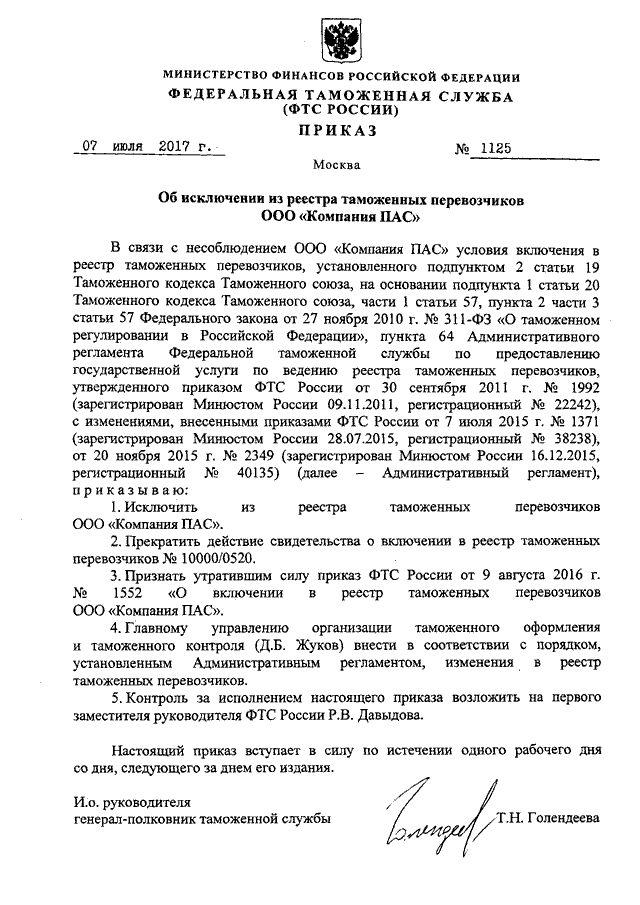 ПРИКАЗ ФТС РФ от 07.07.2017 N 1125