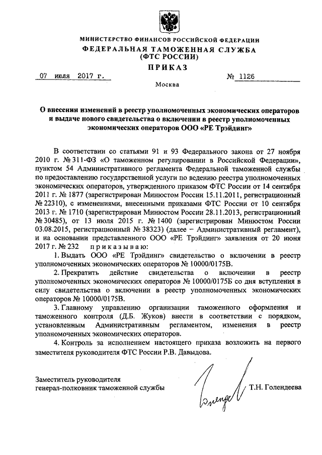 ПРИКАЗ ФТС РФ от 07.07.2017 N 1126