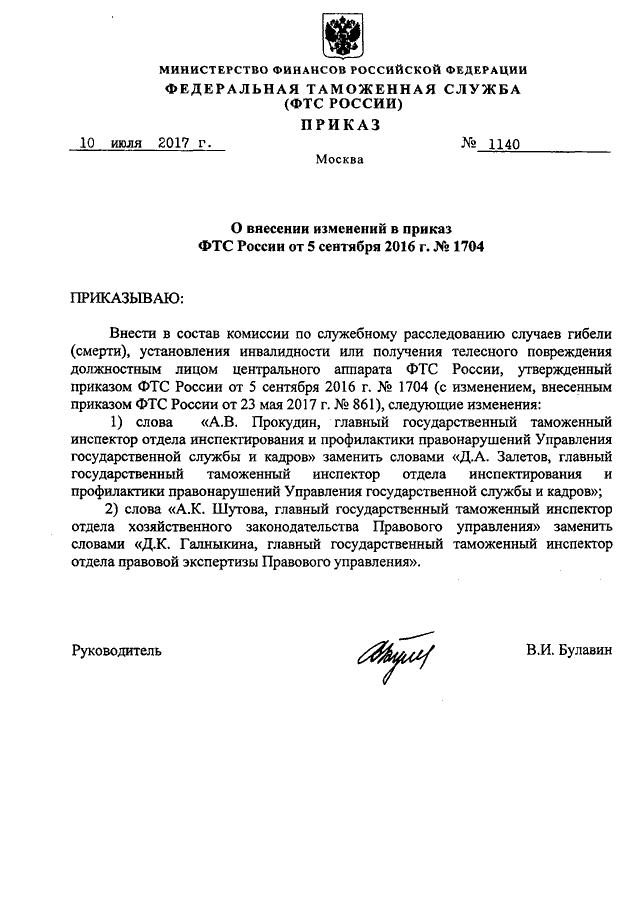 "О ВНЕСЕНИИ ИЗМЕНЕНИЙ В ПРИКАЗ ФТС РОССИИ ОТ 5 СЕНТЯБРЯ 2016 Г. N 1704"