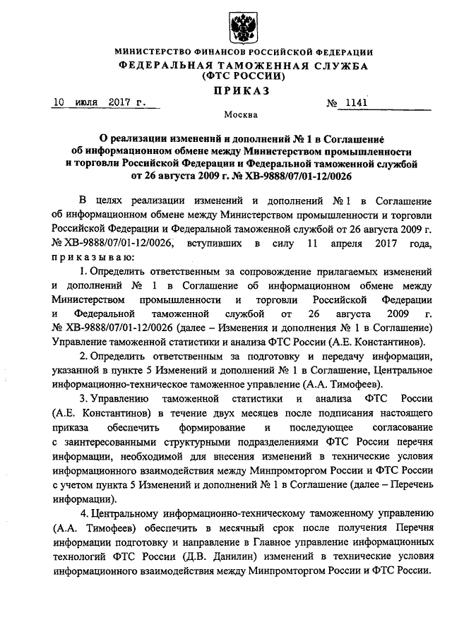 ПРИКАЗ ФТС РФ от 10.07.2017 N 1141