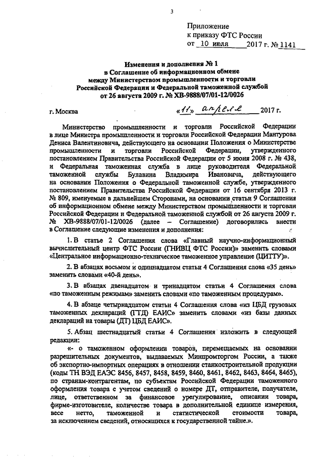 "О РЕАЛИЗАЦИИ ИЗМЕНЕНИЙ И ДОПОЛНЕНИЙ N 1 В СОГЛАШЕНИЕ ОБ ИНФОРМАЦИОННОМ ОБМЕНЕ МЕЖДУ МИНИСТЕРСТВОМ ПРОМЫШЛЕННОСТИ И ТОРГОВЛИ РОССИЙСКОЙ ФЕДЕРАЦИИ И ФЕДЕРАЛЬНОЙ ТАМОЖЕННОЙ СЛУЖБОЙ ОТ 26 АВГУСТА 2009 Г. N ХВ-9888/07/01-12/0026"