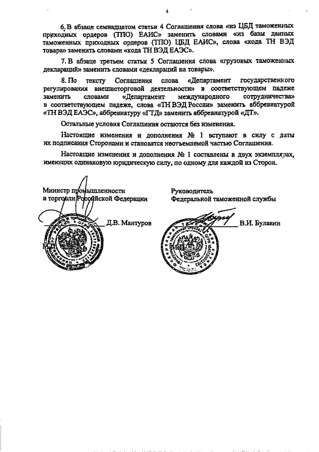 "О РЕАЛИЗАЦИИ ИЗМЕНЕНИЙ И ДОПОЛНЕНИЙ N 1 В СОГЛАШЕНИЕ ОБ ИНФОРМАЦИОННОМ ОБМЕНЕ МЕЖДУ МИНИСТЕРСТВОМ ПРОМЫШЛЕННОСТИ И ТОРГОВЛИ РОССИЙСКОЙ ФЕДЕРАЦИИ И ФЕДЕРАЛЬНОЙ ТАМОЖЕННОЙ СЛУЖБОЙ ОТ 26 АВГУСТА 2009 Г. N ХВ-9888/07/01-12/0026"