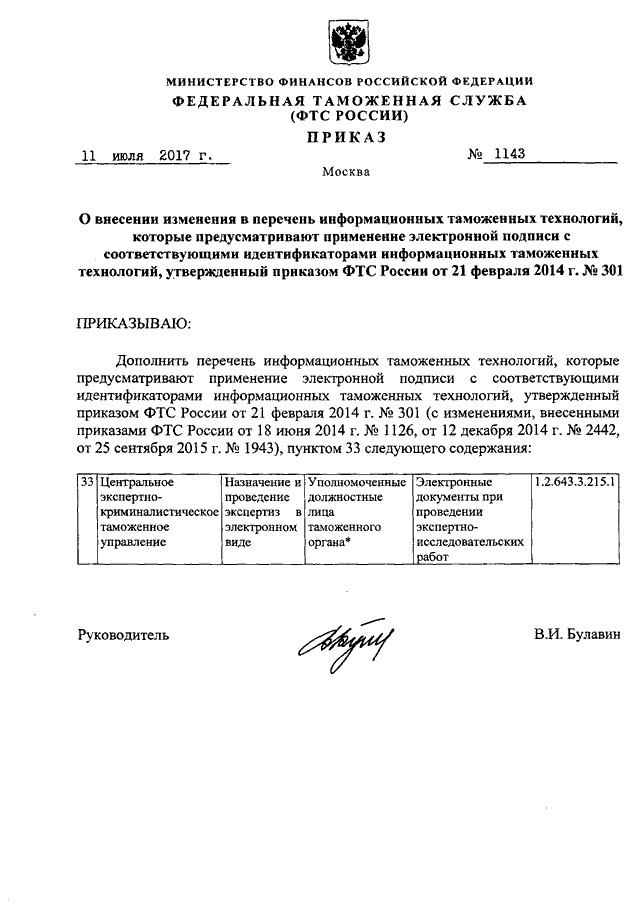 ПРИКАЗ ФТС РФ от 11.07.2017 N 1143 "О ВНЕСЕНИИ ИЗМЕНЕНИЯ В ПЕРЕЧЕНЬ ИНФОРМАЦИОННЫХ ТАМОЖЕННЫХ