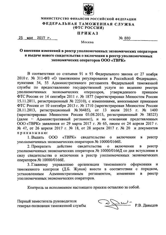 "О ВНЕСЕНИИ ИЗМЕНЕНИЙ В РЕЕСТР УПОЛНОМОЧЕННЫХ ЭКОНОМИЧЕСКИХ ОПЕРАТОРОВ И ВЫДАЧЕ НОВОГО СВИДЕТЕЛЬСТВА О ВКЛЮЧЕНИИ В РЕЕСТР УПОЛНОМОЧЕННЫХ ЭКОНОМИЧЕСКИХ ОПЕРАТОРОВ ООО "ТВРК"