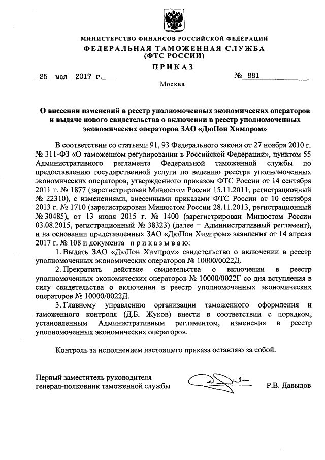 "О ВНЕСЕНИИ ИЗМЕНЕНИЙ В РЕЕСТР УПОЛНОМОЧЕННЫХ ЭКОНОМИЧЕСКИХ ОПЕРАТОРОВ И ВЫДАЧЕ НОВОГО СВИДЕТЕЛЬСТВА О ВКЛЮЧЕНИИ В РЕЕСТР УПОЛНОМОЧЕННЫХ ЭКОНОМИЧЕСКИХ ОПЕРАТОРОВ ЗАО "ДЮПОН ХИМПРОМ"