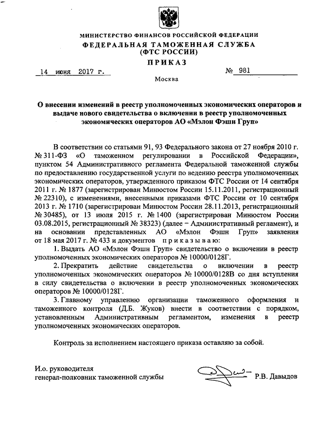 ПРИКАЗ ФТС РФ от 14.06.2017 N 981