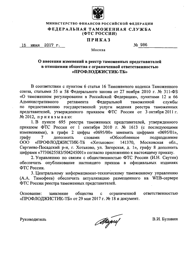 ПРИКАЗ ФТС РФ от 15.06.2017 N 986