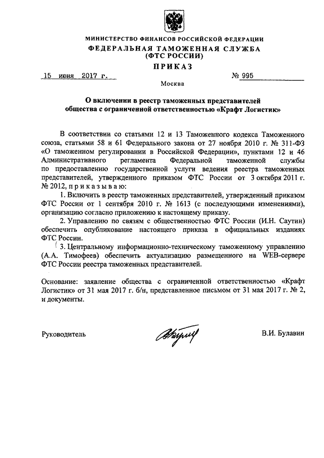 ПРИКАЗ ФТС РФ от 15.06.2017 N 995