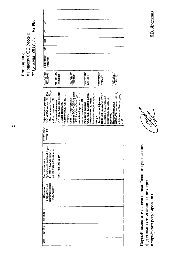 ПРИКАЗ ФТС РФ от 15.06.2017 N 996