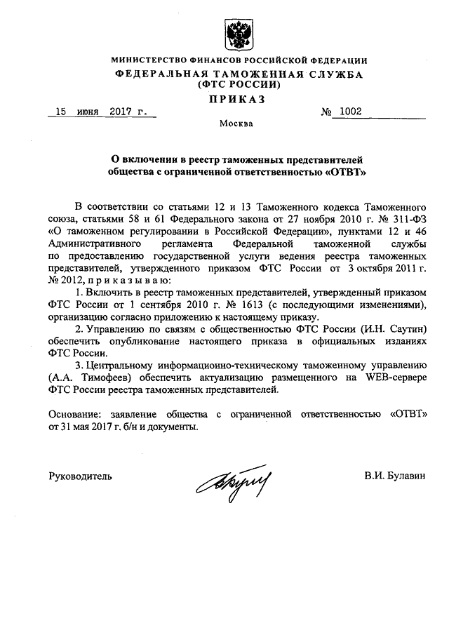 ПРИКАЗ ФТС РФ от 15.06.2017 N 1002